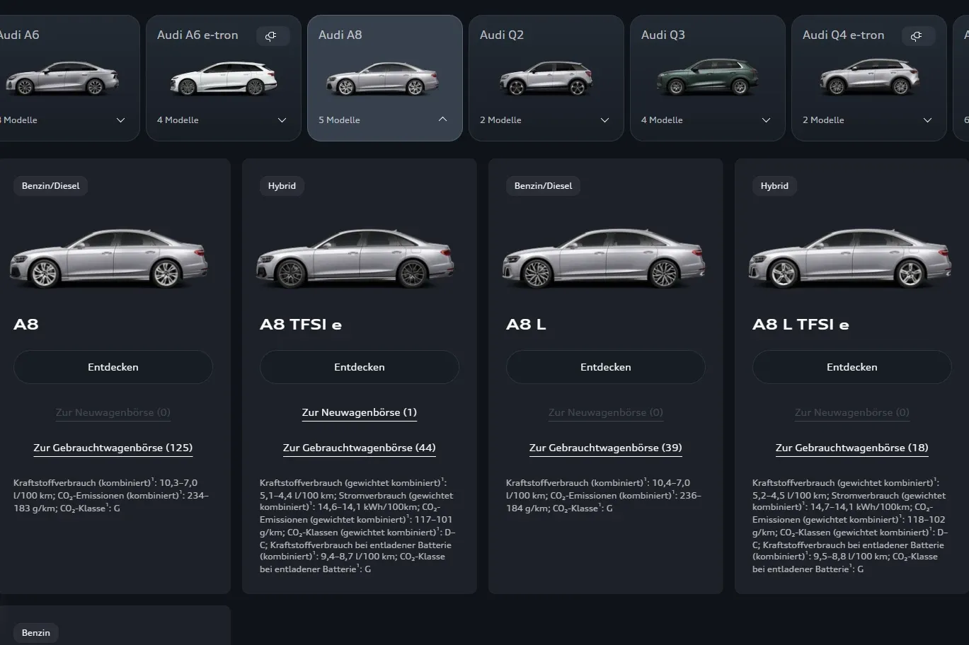 Người dùng tại Đức giờ đây không thể đặt cấu hình mới cho dòng xe Audi A8. Thay vào đó, trang web dẫn khách hàng đến danh sách các mẫu xe có sẵn hoặc xe cũ. |
