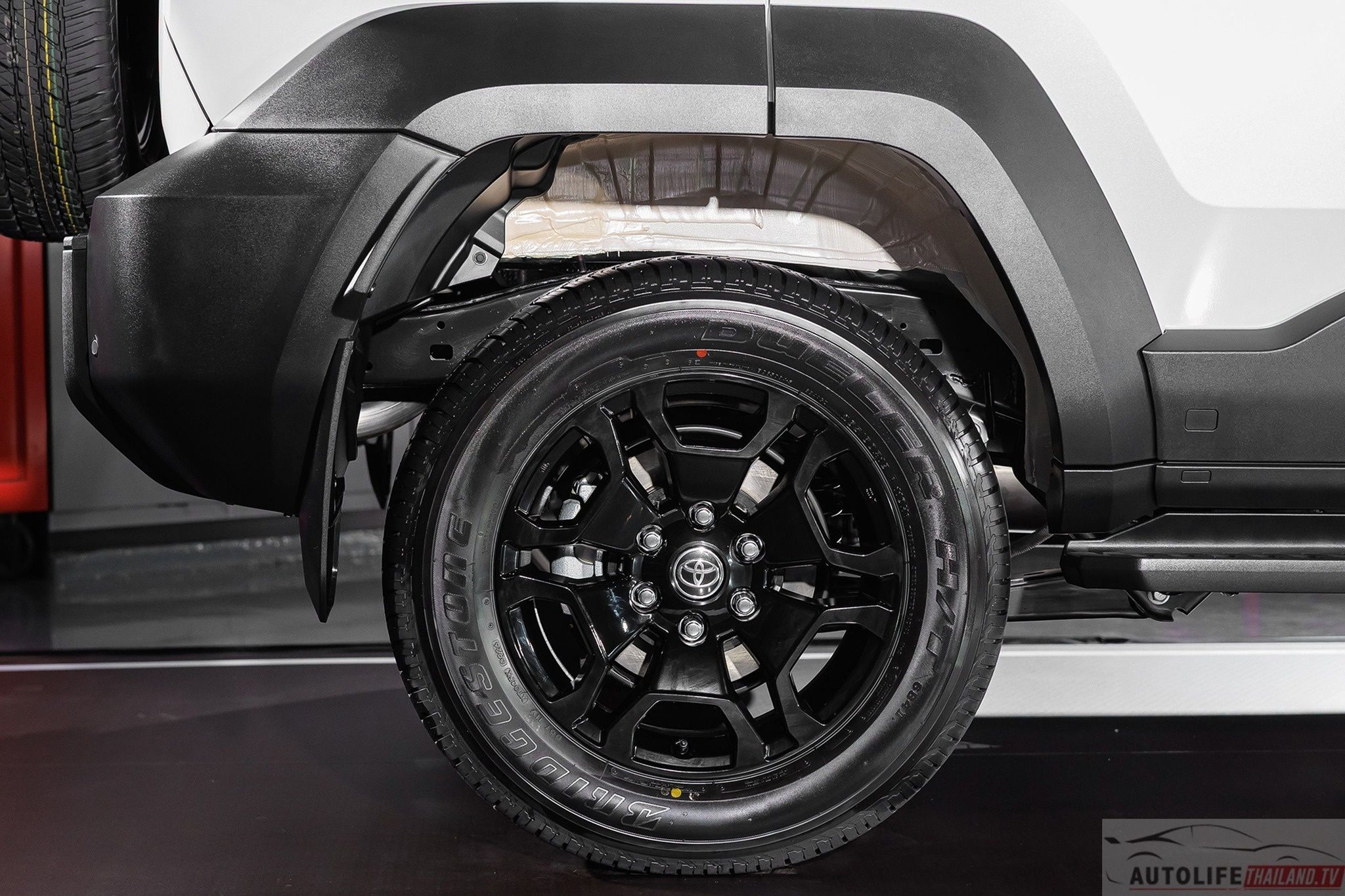 Xe được trang bị tiêu chuẩn bộ mâm hợp kim kích thước 18 inch sơn đen, đi kèm lốp Bridgestone Dueler H/T có thông số 265/60 R18 và hệ thống phanh đĩa trước/sau. |