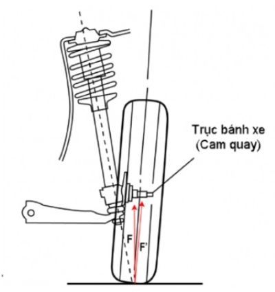 Nếu Camber bằng không thì tải trọng đặt lên trục cam quay sẽ đặt vào giao điểm giữa đường tâm của lốp xe và trục cam quay một lực (Ký hiệu là F\’). Lực này sẽ dễ làm cong trục của Cam quay. Việc đặt góc Camber dương sẽ làm tải tác dụng vào trục cam quay ở phía trong (Lực ký hiệu là F), điều này làm giảm lực tác dụng lên trục của cam quay (Như hình bên dưới).