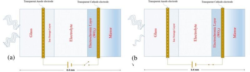 Sơ đồ cấu tạo của gương điện sắc trong hình (a) trường hợp mạch hở, hấu hết ánh sáng đến đều được gương phản xạ lại.Sơ đồ (b) khi đặt điện thế vào điện cực, một phần ánh sáng tới sẽ bị hấp thụ do đó làm giảm lượng ánh sáng phản xạ.
