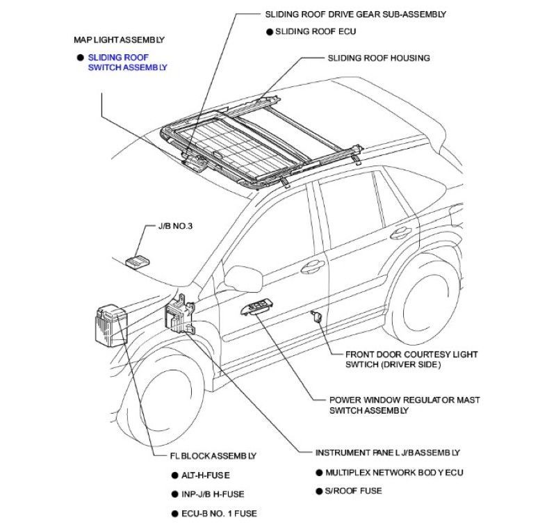 Là vị trí gắn công tắc điều khiển cửa sổ trời. Truyền tín hiệu qua dây dẫn đến Junction Block và ECU cửa sổ trời.