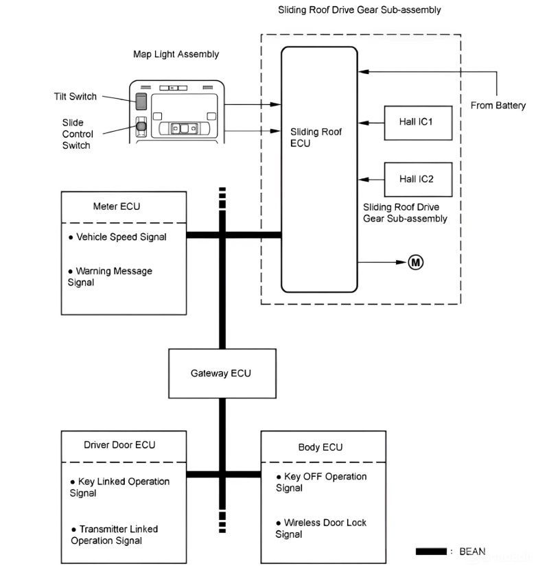 Cửa sổ trời sử dụng một mô tơ DC đảo chiều kết hợp với ECU chuyên dụng (Sliding Roof ECU) để thực hiện các chức năng trượt (slide) hoặc nghiêng (tilt). ECU điều khiển mô-tơ theo nhiều chiến lược khác nhau, bao gồm điều khiển thời gian nhấn công tắc, tốc độ quay mô-tơ, phát hiện lực phản hồi, và bảo vệ an toàn chống kẹt.