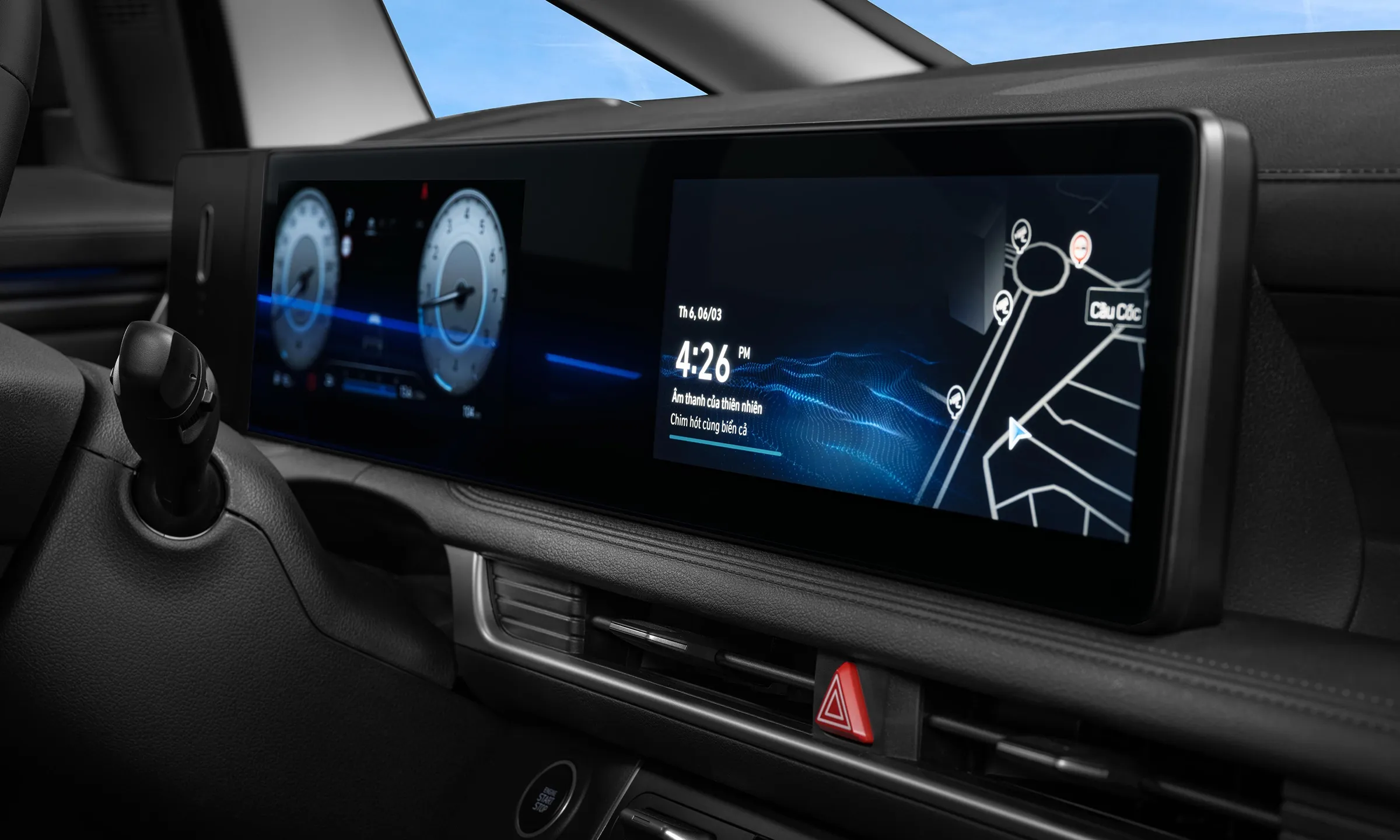 Khoang lái vẫn cách sắp xếp các chi tiết như bản máy xăng nhưng màn hình cảm ứng kép lớn hơn, loại 12,3 inch, một cho đồng hồ tốc độ, một cho hệ thống giải trí. Ở bản máy xăng, cần số ở yên ngựa, còn bản hybrid đặt sau vô-lăng.