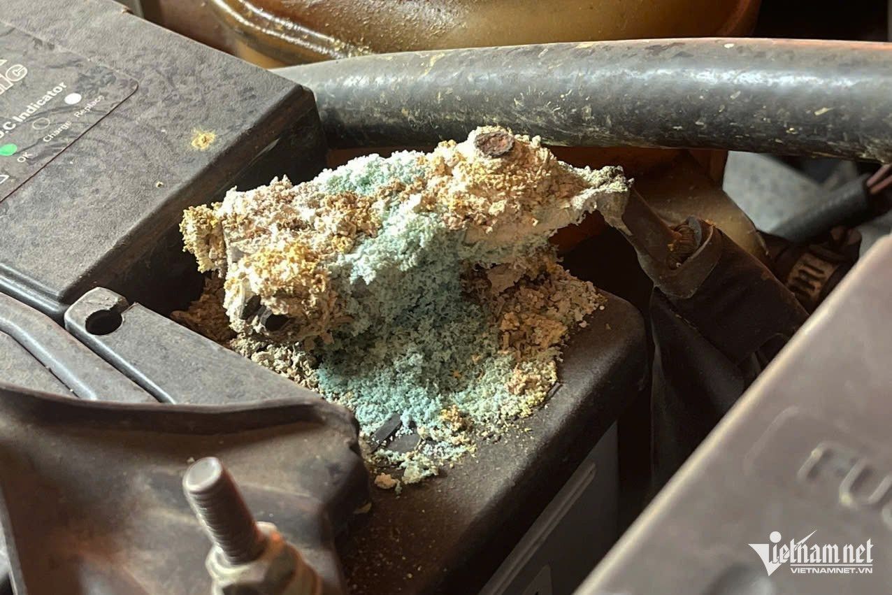 Cực ắc quy ô tô bị mốc do rò rỉ dung dịch. Ảnh: Hoàng Hiệp