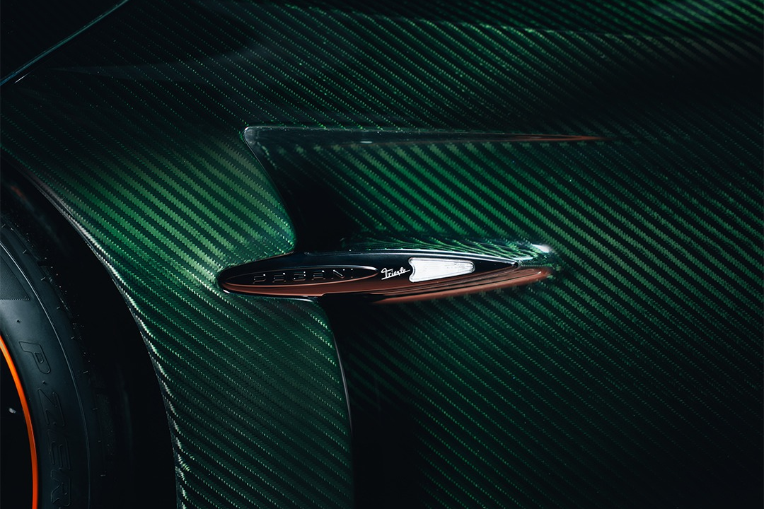 Chiếc Pagani Huayra 70 Trionfo đầu tiên sở hữu phần thân vỏ màu xanh Transparent Verde Smeraldo hoàn toàn bằng sợi carbon, kết hợp các chi tiết tương phản màu cam. |