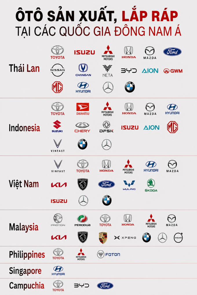 Việt Nam có khoảng 14 hãng tự đầu tư hoặc liên doanh đối tác xây dựng nhà máy. Năm 2025, số lượng xe xuất xưởng hơn 480.000 xe, khiêm tốn hơn nhiều Thái Lan hay Indonesia.